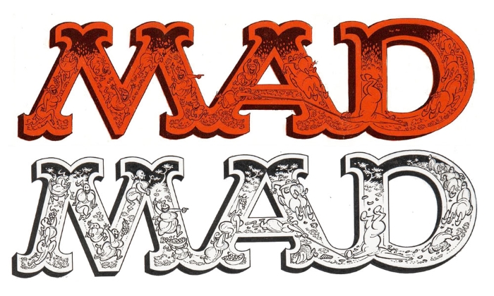 When Harvey Kurtzman created this MAD logo art for the new magazine format that started with issue #24 [link added], he gave visual form to the comic’s unruly heart. Each letter swells with playful, doughy figures locked in an endless frolic, capturing the madcap energy that fueled every issue. Though the in-logo characters vanished after issue #95…