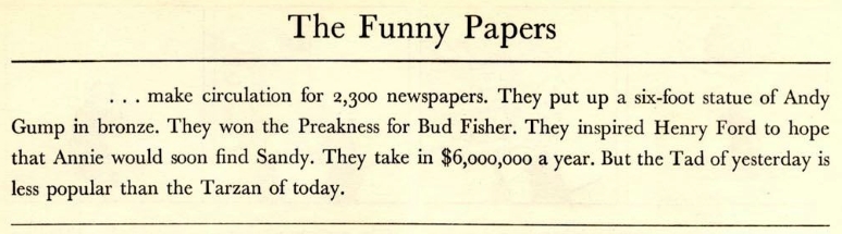 At Panels & Prose Sreve Smith reviews the accounting and assumptions of a 1933 Fortune magazine article about comics strip with the help of nearly a hundred years of hindsight.