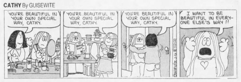 For Guisewite, Cathy posed a means to parse a complicated sociopolitical moment. “Women of my era lived through such change, and the expectations for women were so different and challenging and new that when I started this strip, it was born out of that confusion and feeling like I had a foot in the old, traditional world and a foot in the new world,” she tells me. “Of course, as I started hearing from women about Cathy, I realized that I was not the only one; a lot of us felt that way, whether it was out loud or secretly.”