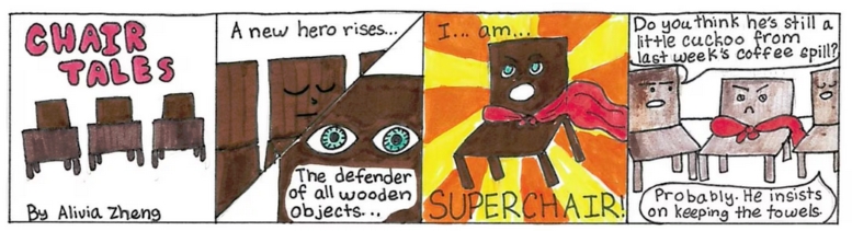 The Lane Libraries and Journal-News invited cartoonists from 7-years-old to adults to submit original comic strips for the Just Humor Us contest … The winners in each category are: Adults: Stormy Bailey, for Library Checkout; Teens (12-17): Trevor Banks, for The Hot Dog Vendor; and Kids (7-11): Alivia Zheng, for Chair Tales.