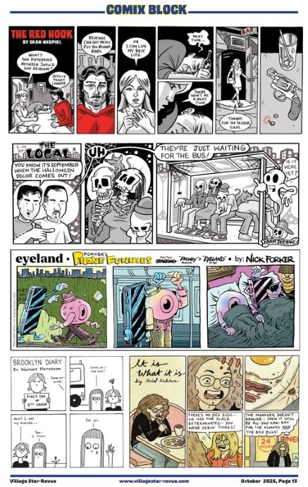 This is part of our new center section featuring comics pages curated by Dean Haspiel from the neighborhood, Marc Jackson from England, and the rest of them, including two greats – Stan Mack and Michael Arthur. This is the first of an ongoing committment to the comic arts by the Red Hook and the Village Star-Revue.