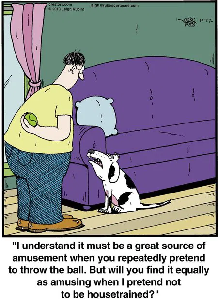 Leigh Rubin offers more humor in this look at canine/human relationships. There have been several gags about pretending to throw the ball, but I like this one because there are people who have logical discussions with their dogs, and reversing it simply amplifies the absurdity.