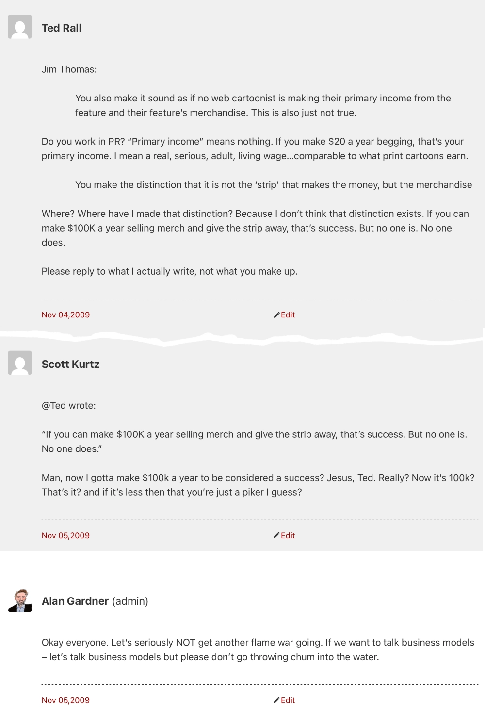 I remember Ted Rall falsely insisting that most of us were “trust fund babies” and that we didn’t really earn a living from our websites and work. He refused to believe we had real businesses and demanded to see our tax returns.