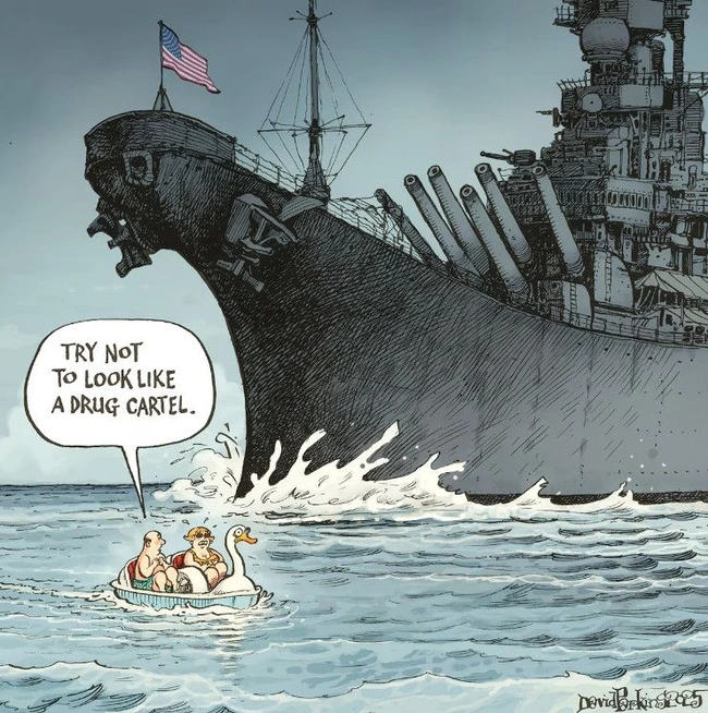 The whole world is watching. Parkins is British-born but lives in Canada and an Australian cartoonist reposted this. It’s funny but not so funny if you’re actually in one of those boats or if you have children of military age or if you live in Venezuela.