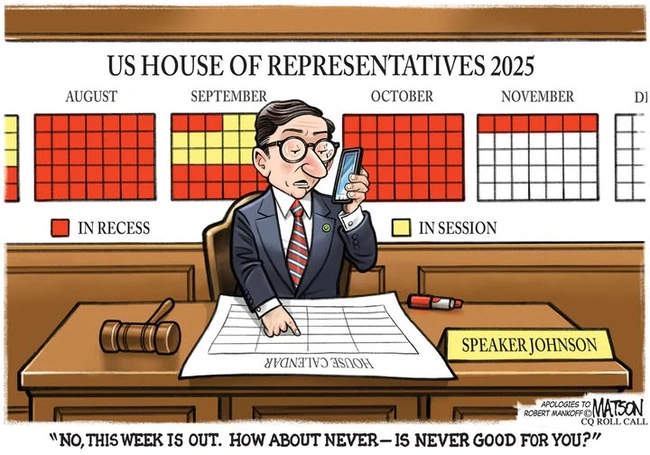 As for consulting with Congress, what’s the point? Johnson isn’t about to let the House resume business anytime soon, and, even if he did, just as Matson drew a parody of Bob Mankoff’s instant classic, Johnson’s been doing an extraordinarily good imitation of Sgt Schulz from Hogan’s Heroes.