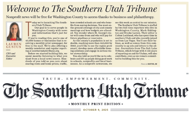 On October 9, a Thursday, The Southern Utah Tribune published its first issue. The monthly, free print newspaper, identified as a “product of the Salt Lake Tribune,” was mailed to 40,000 homes and businesses across Washington County (population just over 200,000), the fast-growing southwest corner of the state in what’s known as red rock country. Beyond an array of news stories, its index points readers to a calendar, obituaries, puzzles, sports, and a “voices” opinion section.