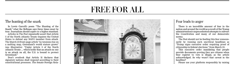 Mariane Angela for (the right wing) Daily Caller reported on The WaPo ridding itself of Free For All and journalists on Friday October 3, 2025 — so did the Saturday October 4 edition carry Free For All?