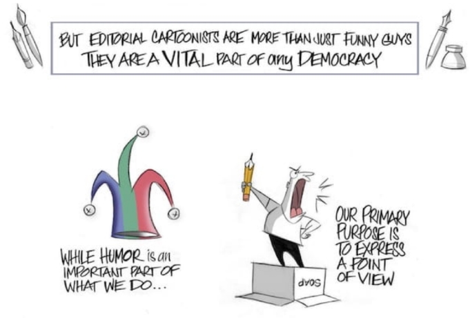 AT: Editorial cartoons and satire play a very important role in democracies. Everyone, regardless of their social standing or level of education, can understand and relate to cartoons. They truly are the great equalizer — autocrats especially dislike being the target of editorial cartoons because of their thin skin.
