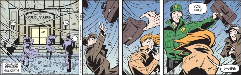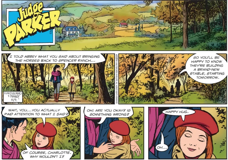 Mike Manley always lets us know what season it is in Judge Parker and he does a fantastic job of it in the top two tiers today. While Francesco Marciuliano‘s sentimental, but not mauldlin, script in the lower two tiers is also more than admirable for those who have been following the story. And I, who often complain about Ces messing with those Manley Sunday title panels by adding a word balloon, appreciate the restraint shown today. Then add in the beautiful Fall coloring by Mimi Simon and we have a complete Page worthy of being placed beside the best of those Frank King Walt and Skeezix Autumn pages.