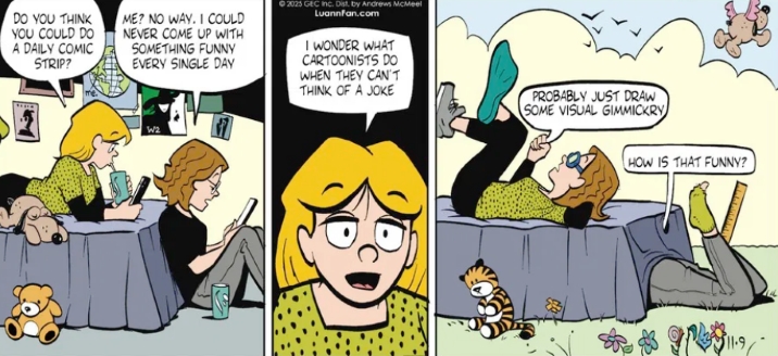 2. P.S. I liked the way Luann’s bear transmogrified into Hobbes. Watterson once wrote: “Whenever deadlines force me to go with a weak idea, I go for broke on the illustration.