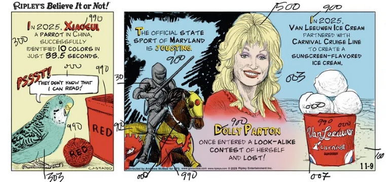 Somebody, Kieran Castaño? CoGomics crew?, left the color guide notes in today’s Ripley’s Believe It or Not. Not the first time it has happened at GoComic and probably not the last time.