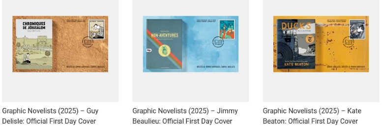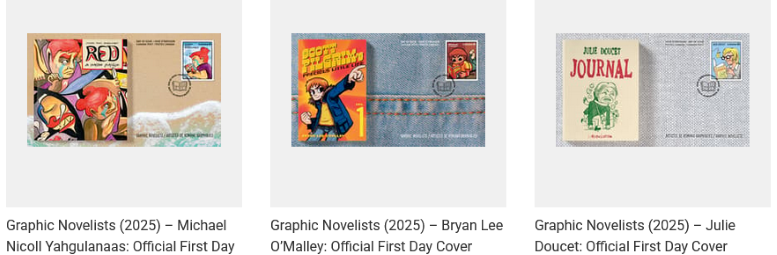 Canada has produced several prominent graphic novelists, and this stamp issue shines a light on six influential Canadian creators: Kate Beaton, Jimmy Beaulieu, Guy Delisle, Julie Doucet, Bryan Lee O’Malley, and Michael Nicoll Yahgulanaas [emphasis added].