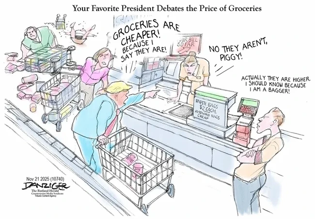 Meanwhile, people who have, personally, been inside of grocery stores are wising up to the absurd boasting of a man who not only thinks “groceries” is an exotic term but believes that you have to show photo ID to buy a box of cereal, and who keeps telling them food is less expensive when it most clearly is not.