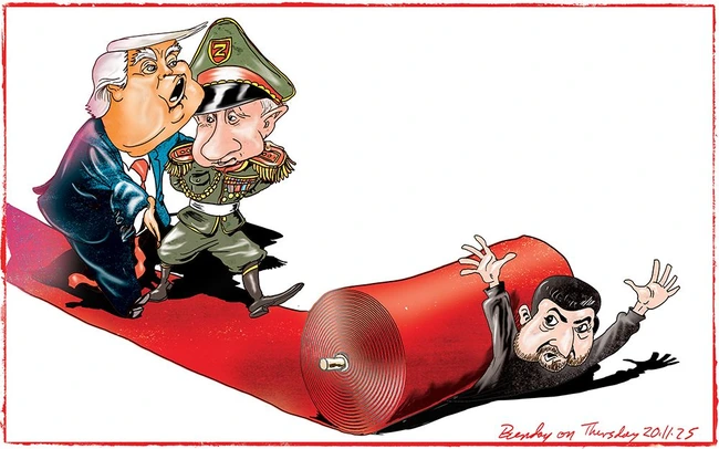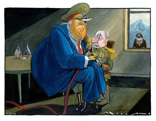 And Chappatte simply boils it down to the basics: Putin and Trump have come up with a plan and expect Zelensky to sign it by this Thursday or Dear Leader is threatening to halt all military assistance and let the author of the plan take as much of Ukraine as he would like.