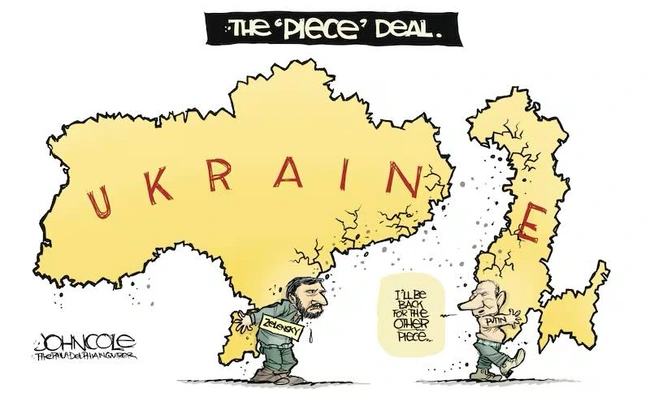 Now the Republicans are quarreling amongst themselves because the proposed agreement clearly gives Russia everything it wants except the rest of Ukraine, though it includes an agreement to keep peacekeepers out, which smells suspiciously like giving Russia the rest of Ukraine.