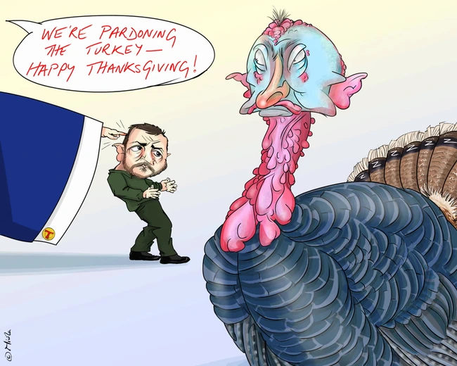 Combined with the Thanksgiving deadline Dear Leader has set for Zelensky to betray his country, this is well above the run-of-the-mill pardoned-turkey gags, particularly since she’s in Britain where Thanksgiving is someone else’s celebration.