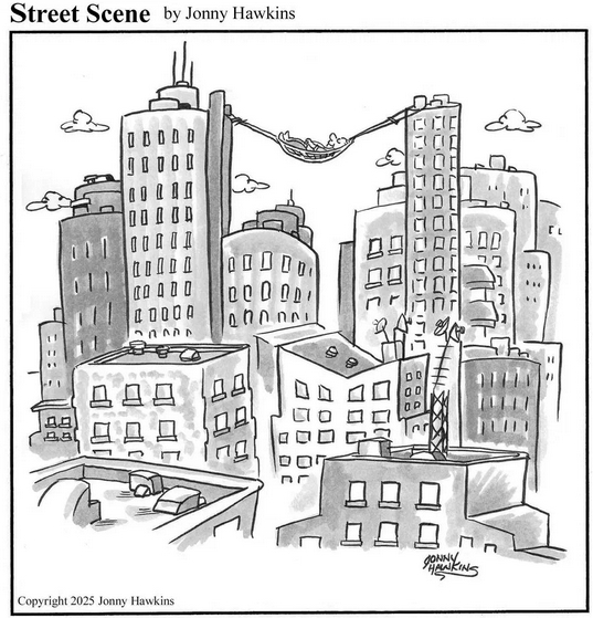 Street Scene is by long-time cartoonist Jonny Hawkins.