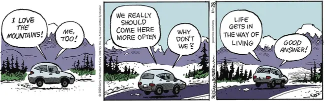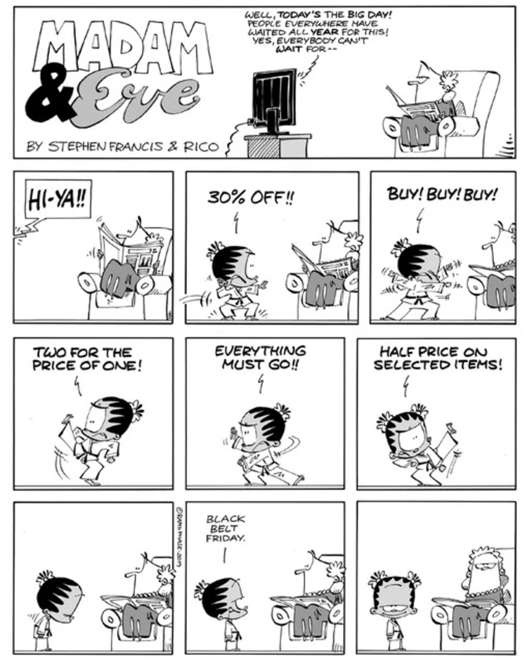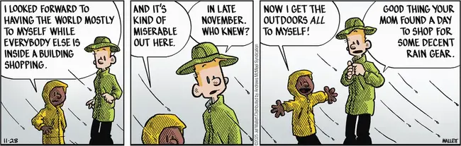 Caulfield occasionally bends himself into a pretzel to be a snob, and standing out in the rain to avoid Black Friday shopping is a pretty good example. Frazz would run or cycle in lousy weather, but I’ll bet Caulfield wouldn’t go outside if he weren’t proving a point.