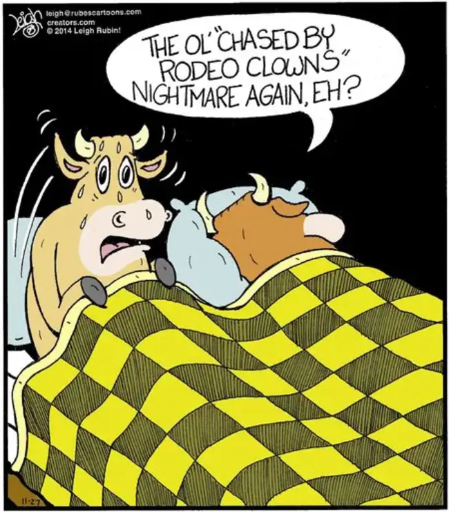 This ain’t my first rodeo, but I’m willing to stand mooot on this gag, because maybe rodeo bulls do have that nightmare, but I sure doubt it. “Rough stock” — the bulls and broncos who specialize in bucking off riders — are chosen not so much for fierceness as for refusal to put up with being ridden.