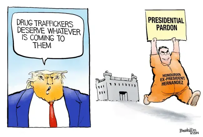 Dear Leader wants to slaughter people in boats because they might be carrying drugs, but then he pardons a dealer who brought 400 tons of cocaine into the country.