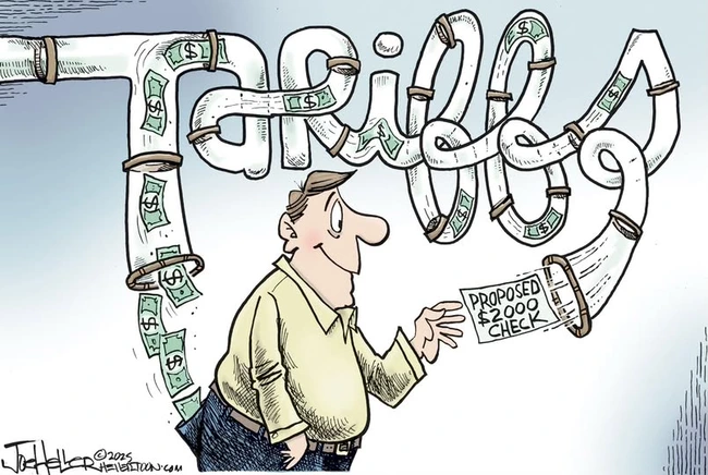 But Dear Leader keeps saying the tariffs are paid by the exporting nation, which is a stupid thing to say, or, at least, it’s a stupid thing to say by accident. Anybody who took five minutes to look it up would quickly discover that importers, not exporters, pay tariffs. And anybody who had been paying attention in high school social studies wouldn’t have to.