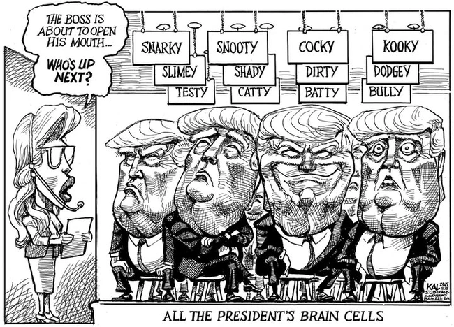 And speaking of a hundred stupid things before breakfast, Weyant is being awfully kind with this made-up presidential schedule. Dear Leader’s day doesn’t even start until 11 a.m. or noon, in part because he sits up all night tapping out nonsense on Truth Social.
