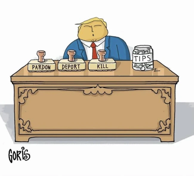 In the meantime, the Golden Phallus will join the rest of Trump’s gilded accoutrements surrounding his otherwise uncluttered desk. When you only work two or three hours a day, it’s important to get the decision-making to an efficient minimum and Goris seems to sum things up.