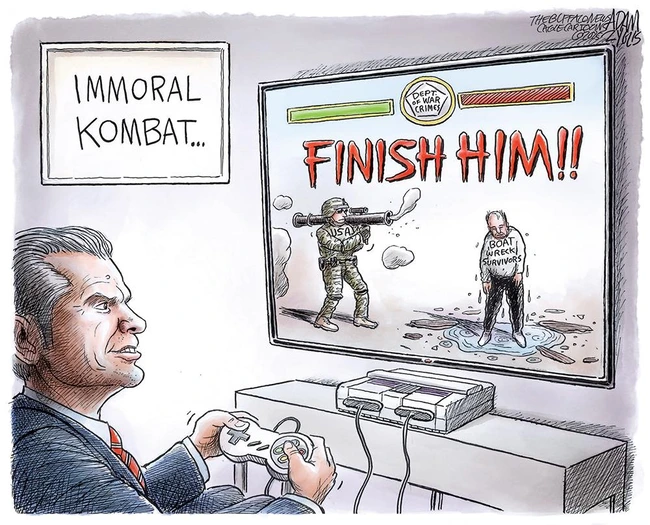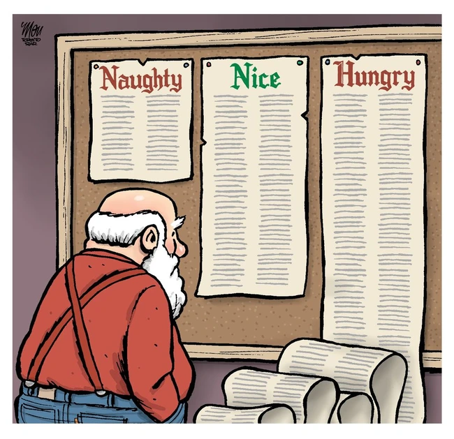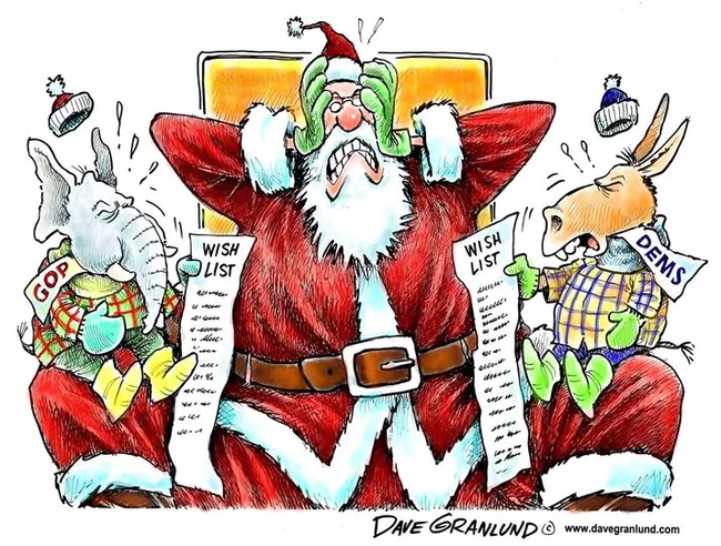 Granlund salutes the holidays with a cartoon about how both sides want things, damn them. The Democrats want poor children fed and housed and to have health care, while the Republicans want tax breaks for billionaires and for brown and black people to be rounded up and deported.