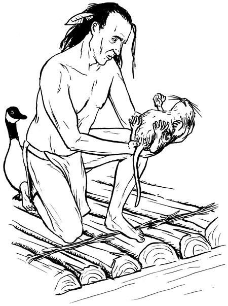 In the Anishinaabe version of the legend, the trickster/creator OldMan gathers the animals on a raft and, as supplies dwindle, sends his best divers, starting with Loon and Otter, down to see how deep the waters remain.