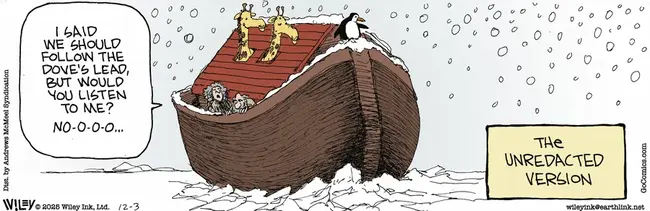 Wiley depicts Noah as an eater of Tide pods, and the number of misfires makes the whole thing work. Had he stuck any closer to the actual story, the joke would fail, but he mashes up Noah and Shackleton, which spans time, distance and common sense, while maintaining the traditional giraffes among the cargo.