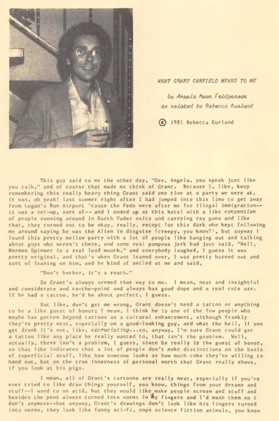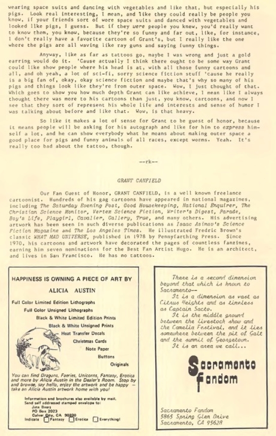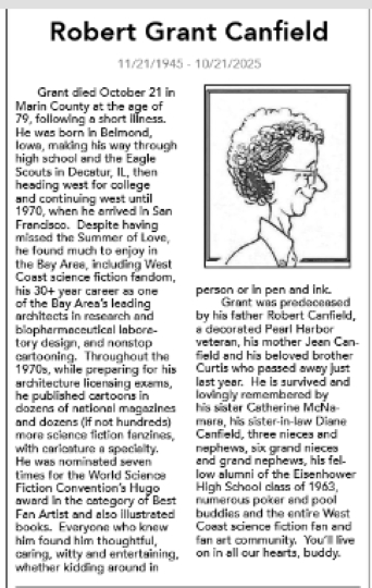 Although his career as a commercial artist and cartoonist (Ray Faraday Nelson was at one period his regular gag writer) left him less and less time for Fandom, Canfield continued to publish intermittently in the fanzines until at least 2020.