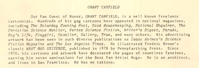 In 1981 Grant Canfield was a guest of honor at Westercon 34. From that program book (pdf):