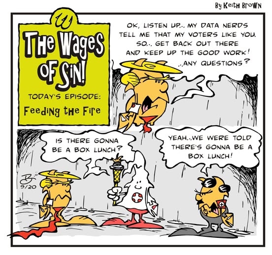 In an early 2019 interview with Mr. Media Keith said he gave up the strip (temporarily) because during the Trump years politics became the center of attention and he felt it was becoming a one trick pony. After a short break he returned to The Wages of Sin (and politics).