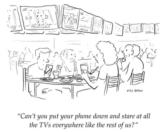 When it comes to taking the family act on the road, Bravo cites sports bars, which I guess are all tuned to the local team when it plays but otherwise have random things playing on two dozen TVs, often with the sound and closed captions both off so it’s just lights and motion.