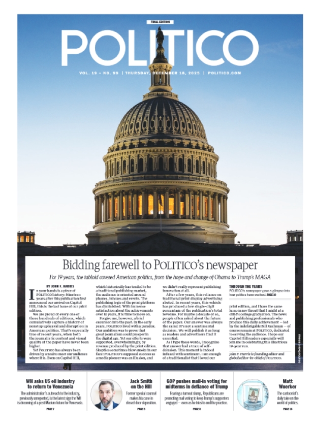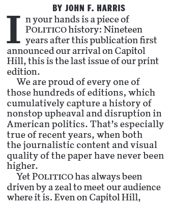 Today is the end of an era. Politico has always been a digital platform, but from the beginning we’ve also had a print edition that was aimed at the Inside the Beltway crowd. Today’s is the last issue of that print edition…