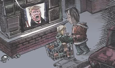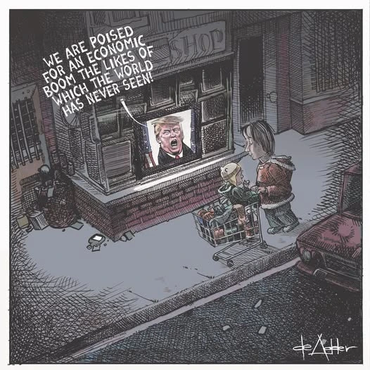 Skip to commentsThere’s a lot to like in this cartoon, starting with the dim lighting that counters the bold bragging about a golden age most people aren’t seeing, and the absolute normalness of the woman and child who walk past the shouting speech, getting on with lives that are neither wretched nor glorious.