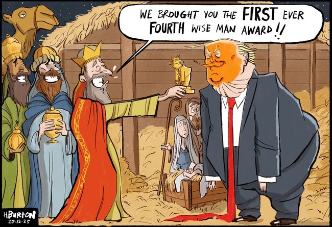 Burton makes a holiday-themed joke about a man so easily flattered that various organizations and whole nations have learned to give him presents and awards to gain his favor, knowing that he is so unconstrained by Constitutional processes that he can make things happen without the approval of Congress or the courts, so long as he remains focused long enough to follow through.