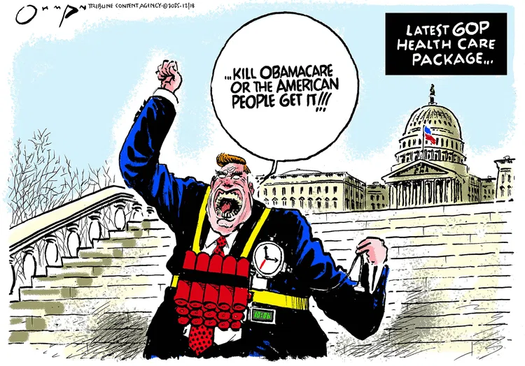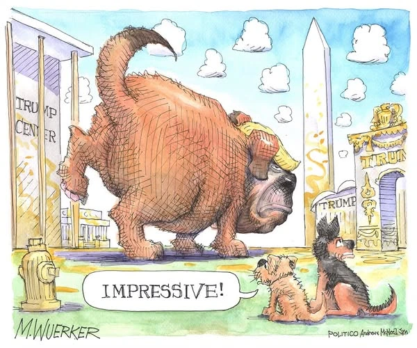 Everything gets named for Trump, to such an extent that Wuerker accuses him of adding his own golden splendor to the nation rather than just the tacky bordello accoutrements he has put up in what’s left of the White House.
