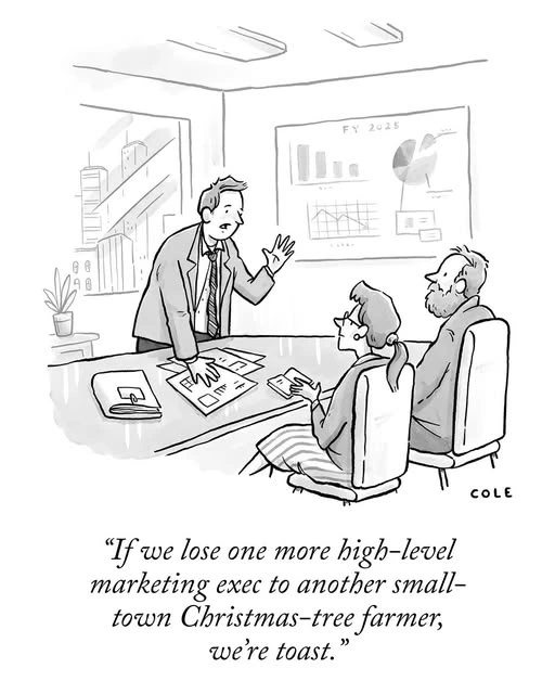 And speaking of holiday traditions, Cole riffs on Hallmark movies in which men in flannel shirts deprogram city girls with growing careers and empty souls or some such thing.