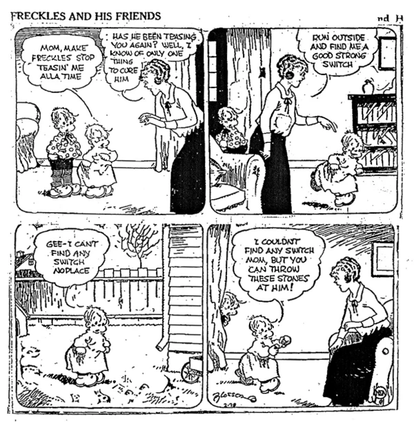 I don’t know the date of this Freckles strip, but I’d guess in the ’20s, since Freckles was a teenager by the ’40s. But even in the ’60s, I had friends for whom “Cut a switch” was part of how they grew up, and I like the fact that Merrill Blosser offered this negative view of that sort of thing.