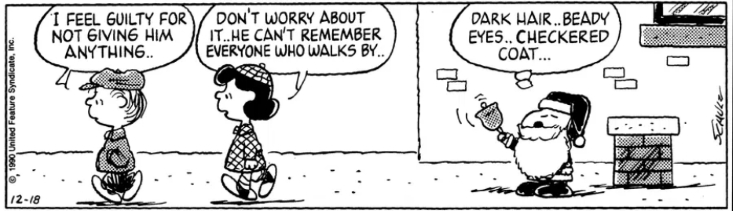 The Peanuts comic strip has been altered from the Charles Schulz original of December 18, 1990.