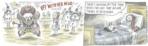 Liniers features a story written in the 19th, not 14th, century, but it’s only in recent years that we’ve turned away from harsh lessons in children’s literature, and it should also be noted that the folktales collected by the Grimm brothers were not intended solely for children but captured themes that applied to the entire community.