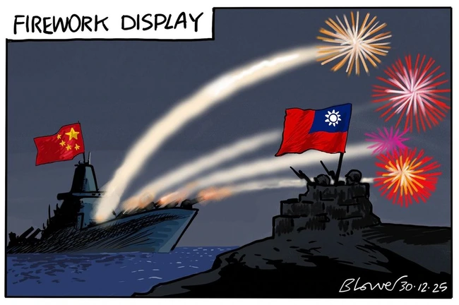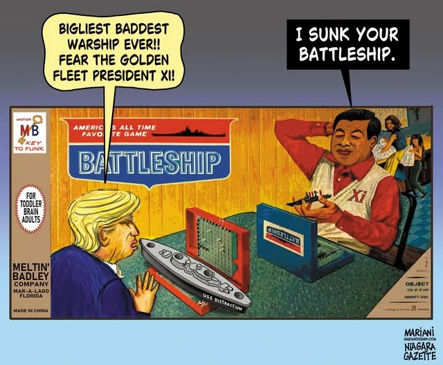 But the foolish proposal is furnishing plenty of laughs for political cartoonists, and Mariani manages to salt his cartoon with a selection of humorous marginalia in addition to making the major point that the prospect of these floating war wagons is hardly intimidating Xi.