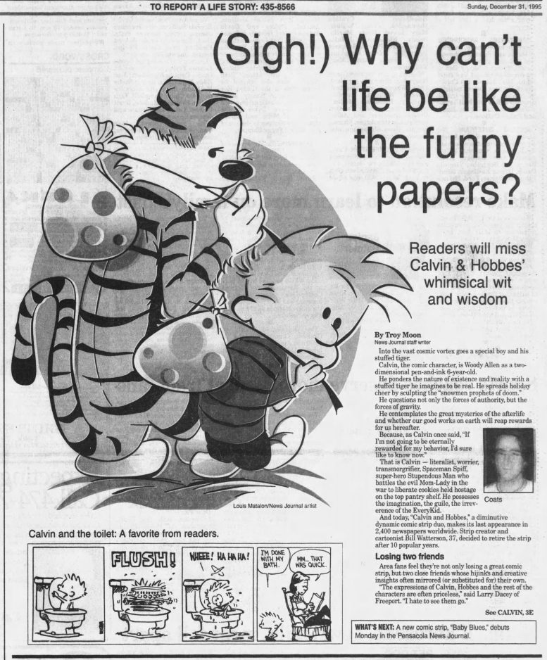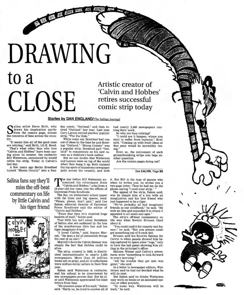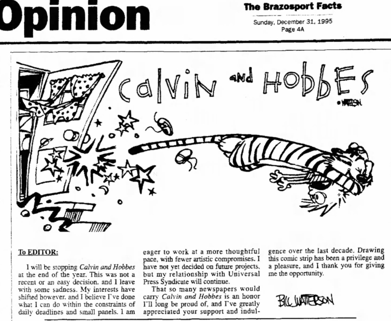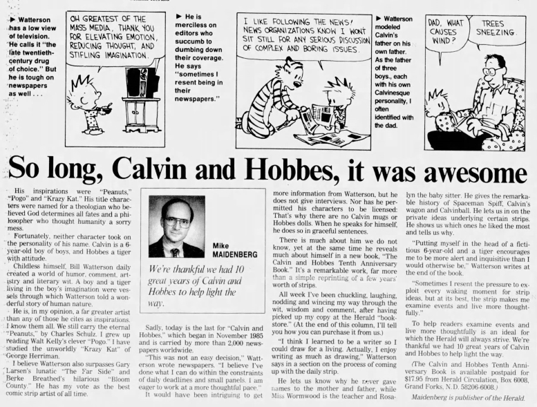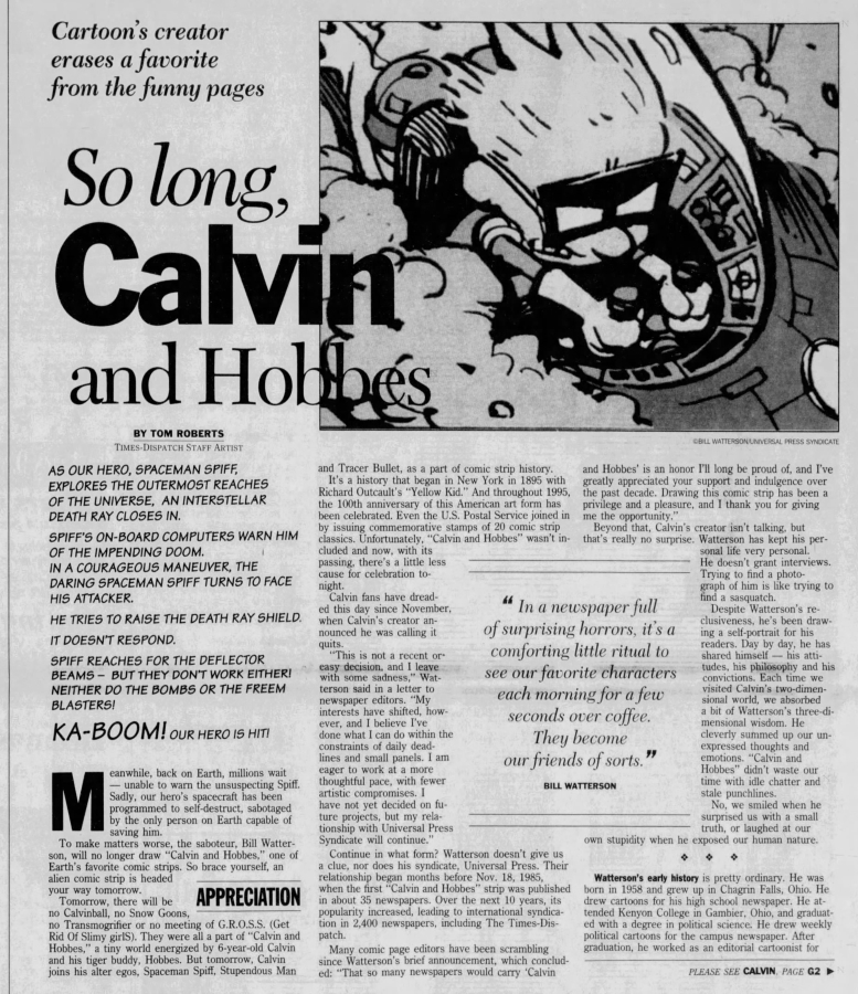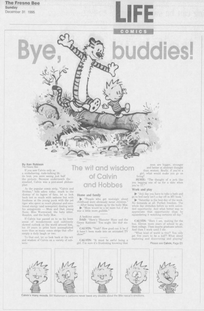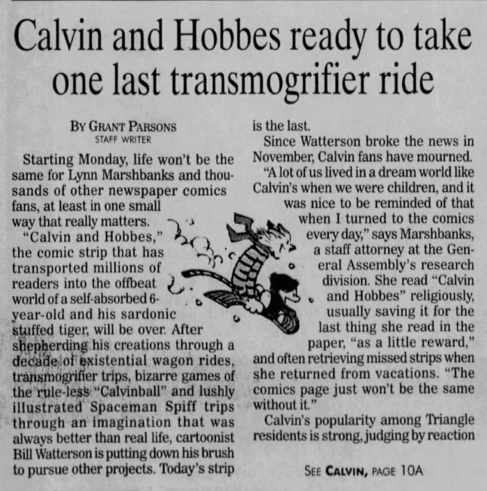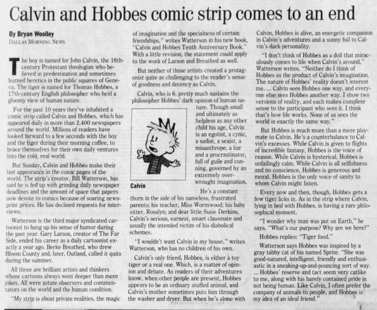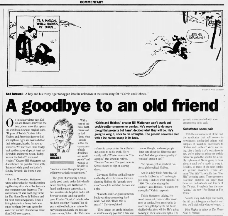 Many newspapers didn’t wait to same-day shock Calvin and Hobbes fans but ran notices and articles the Friday and Saturday before the final Sunday page.