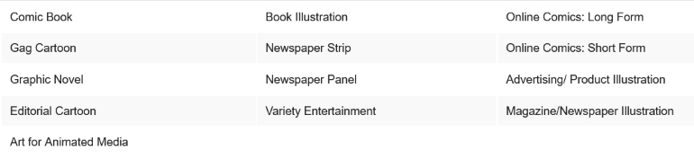 Thus call isn’t limited to editorial cartoons, there are a dozen other categories including newspaper comic strips, newspaper comic panels, comic books, digital comic strips and comic books, graphic novels, gag cartoons, various illustration divisions, and more. Including the return of the animation category.