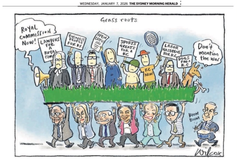 I am flabbergasted that Cathy Wilcox casually dismisses those calling for a royal commission into the Bondi killings as a right-wing, Netanyahu-led conspiracy. It demeans those from all sides of politics who believe in good faith that it is the right thing to do, and is a slap in the face for the families of the dead who asked for it.