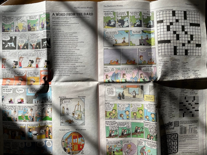 The layout is excellent regardless of what’s in it. A full week of syndicated strips like Dustin, Red & Rover and Big Nate are well-paced and displayed, broken up further by bird facts, Shakespeare quotes, and crossword puzzles.