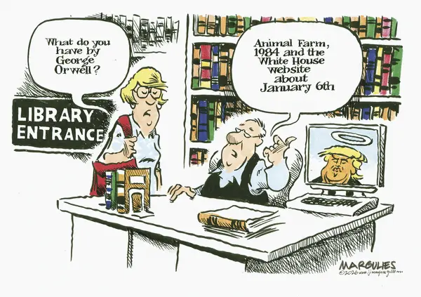 People have been citing 1984, but I’m glad Margulies mentioned Animal Farm, because I think it’s closer to the mark: In 1984, the government actively forces people to accept 2+2=5, but in Animal Farm, the pigs govern with the blissful assurance that the other animals will passively accept whatever they’re told.