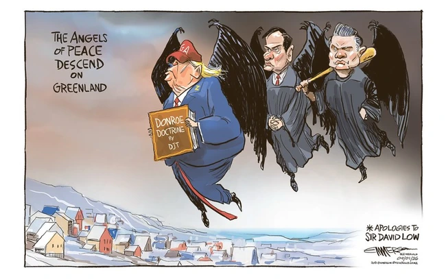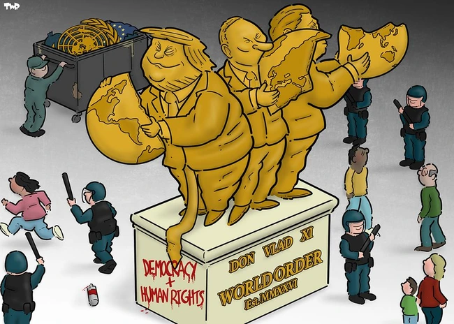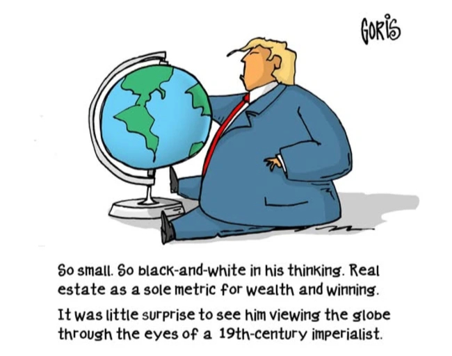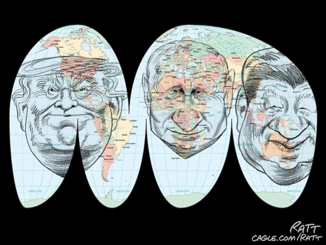 He proudly joins Putin and Xi in dividing up the world into spheres of influence, a form of colonialism and imperialist hegemony that harks back to the 19th Century, though, despite his decision to resurrect what he calls the “Donroe Doctrine,” the divisions are not as clear-cut as Ratt depicts in this familiar projection, another attempt to lay out the planet on a flat plane.