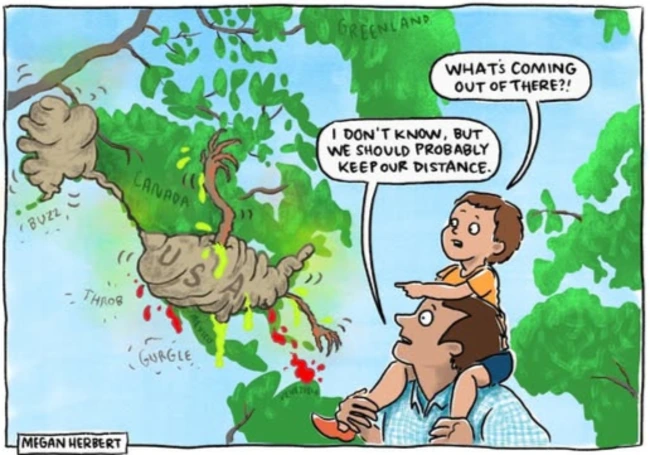 Herbert is also in the Antipodes and thus far away from us, but, like Emmerson, she seems to be able to see clearly from there what many of us apparently can’t see before us, and the father in her cartoon has the right idea, though he assumes he can keep his little boy out of whatever comes next.